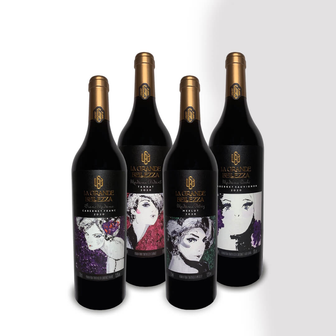 A coleção de vinhos varietais da Vinicola la Grande Bellezza vem representada pelas Madames da pintora Lu Mourelle, personagens carregadas de expressão, convidando o espectador a contemplar o feminino. O combo Coleção Madames Rouges contém os vinhos tintos: Madame Ardant (Tannat), Madame Petriz (Merlot), Franc Madame (Cabernet Franc) e Madame Occhi (Cabernet Sauvignon)